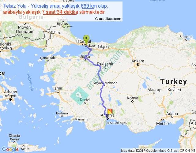 Telsiz Yolu - Yükseliş arası yaklaşık olarak 90 km/h ile yukarıda belirtilen sürede olup, iki yerin kuş uçuşu uzaklığı (mesafesi) 464'dir. Eğer belirtilen yerler arasında uçak seferi var ise bu süre uçakla 42 dakika'ya kadar düşebilir. Yolculuk otobüsle 9 saat 50 dakika sürmektedir.