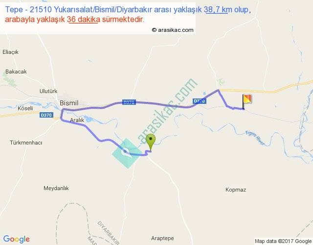 Tepe - 21510 Yukarısalat Bismil Diyarbakır arası yaklaşık olarak 90 km/h ile yukarıda belirtilen sürede olup, iki yerin kuş uçuşu uzaklığı (mesafesi) 13'dir. Yolculuk otobüsle 46 dakika sürmektedir.