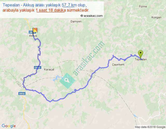 Tepealan - Akkuş arası yaklaşık olarak 90 km/h ile yukarıda belirtilen sürede olup, iki yerin kuş uçuşu uzaklığı (mesafesi) 24'dir. Yolculuk otobüsle 1 saat 41 dakika sürmektedir.