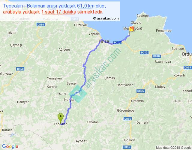 Tepealan - Bolaman arası yaklaşık olarak 90 km/h ile yukarıda belirtilen sürede olup, iki yerin kuş uçuşu uzaklığı (mesafesi) 43'dir. Yolculuk otobüsle 1 saat 40 dakika sürmektedir.