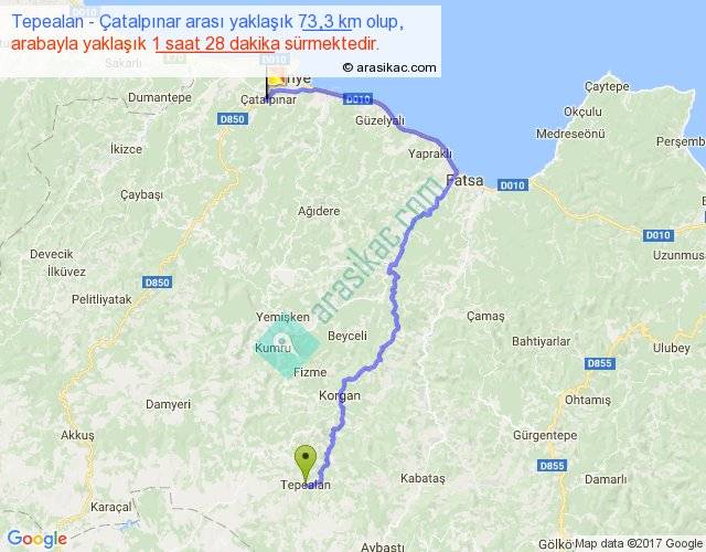 Tepealan - Çatalpınar arası yaklaşık olarak 90 km/h ile yukarıda belirtilen sürede olup, iki yerin kuş uçuşu uzaklığı (mesafesi) 40'dir. Yolculuk otobüsle 1 saat 54 dakika sürmektedir.