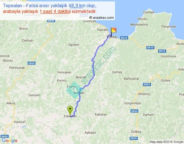 Tepealan - Fatsa arası yaklaşık olarak 90 km/h ile yukarıda belirtilen sürede olup, iki yerin kuş uçuşu uzaklığı (mesafesi) 36'dir. Yolculuk otobüsle 1 saat 23 dakika sürmektedir.