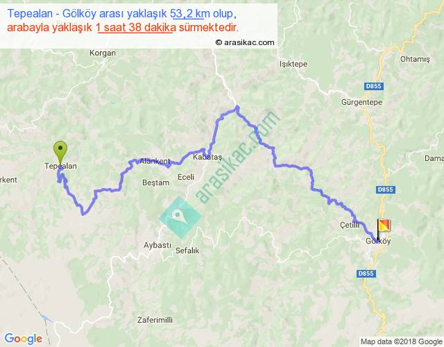 Tepealan - Gölköy arası yaklaşık olarak 90 km/h ile yukarıda belirtilen sürede olup, iki yerin kuş uçuşu uzaklığı (mesafesi) 27'dir. Yolculuk otobüsle 2 saat 7 dakika sürmektedir.