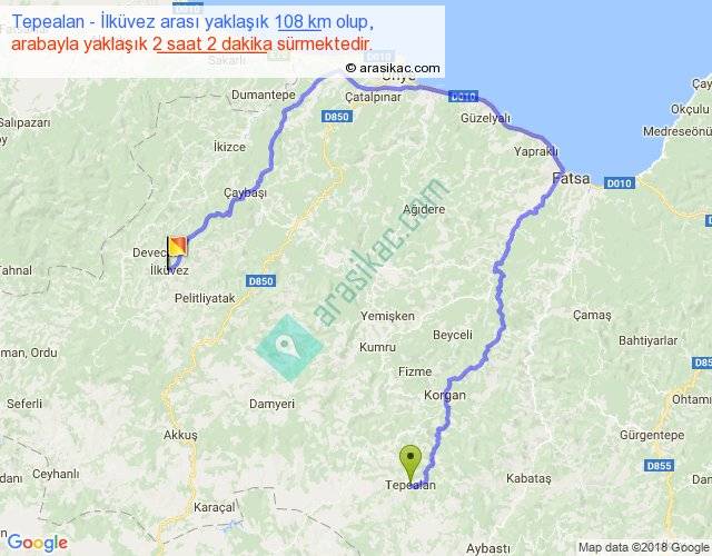Tepealan - İlküvez arası yaklaşık olarak 90 km/h ile yukarıda belirtilen sürede olup, iki yerin kuş uçuşu uzaklığı (mesafesi) 33'dir. Yolculuk otobüsle 2 saat 38 dakika sürmektedir.