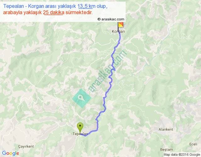 Tepealan - Korgan arası yaklaşık olarak 90 km/h ile yukarıda belirtilen sürede olup, iki yerin kuş uçuşu uzaklığı (mesafesi) 10'dir. Yolculuk otobüsle 32 dakika sürmektedir.