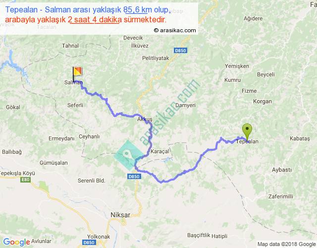 Tepealan - Salman arası yaklaşık olarak 90 km/h ile yukarıda belirtilen sürede olup, iki yerin kuş uçuşu uzaklığı (mesafesi) 43'dir. Yolculuk otobüsle 2 saat 41 dakika sürmektedir.