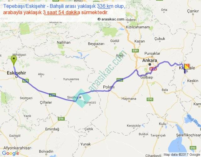 Tepebaşı Eskişehir - Bahşili arası yaklaşık olarak 90 km/h ile yukarıda belirtilen sürede olup, iki yerin kuş uçuşu uzaklığı (mesafesi) 254'dir. Eğer belirtilen yerler arasında uçak seferi var ise bu süre uçakla 23 dakika'ya kadar düşebilir. Yolculuk otobüsle 5 saat 4 dakika sürmektedir.