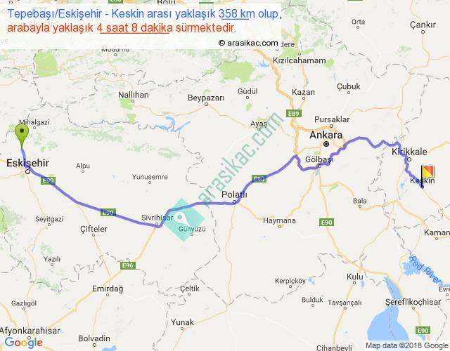 Tepebaşı Eskişehir - Keskin arası yaklaşık olarak 90 km/h ile yukarıda belirtilen sürede olup, iki yerin kuş uçuşu uzaklığı (mesafesi) 267'dir. Eğer belirtilen yerler arasında uçak seferi var ise bu süre uçakla 24 dakika'ya kadar düşebilir. Yolculuk otobüsle 5 saat 22 dakika sürmektedir.