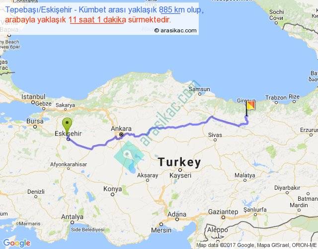 Tepebaşı Eskişehir - Kümbet arası yaklaşık olarak 90 km/h ile yukarıda belirtilen sürede olup, iki yerin kuş uçuşu uzaklığı (mesafesi) 675'dir. Eğer belirtilen yerler arasında uçak seferi var ise bu süre uçakla 1 saat 02 dakika'ya kadar düşebilir. Yolculuk otobüsle 14 saat 19 dakika sürmektedir.