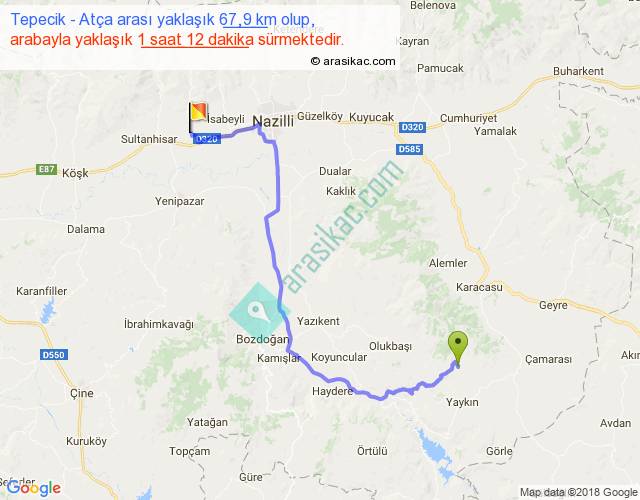 Tepecik - Atça arası yaklaşık olarak 90 km/h ile yukarıda belirtilen sürede olup, iki yerin kuş uçuşu uzaklığı (mesafesi) 43'dir. Yolculuk otobüsle 1 saat 33 dakika sürmektedir.