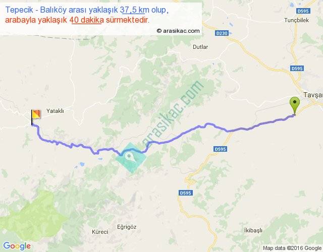 Tepecik - Balıköy arası yaklaşık olarak 90 km/h ile yukarıda belirtilen sürede olup, iki yerin kuş uçuşu uzaklığı (mesafesi) 30'dir. Yolculuk otobüsle 52 dakika sürmektedir.