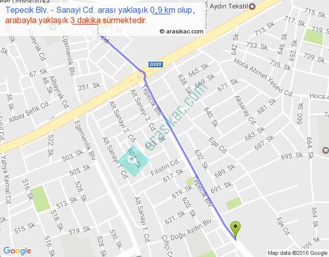 Tepecik Blv. - Sanayi Cd. arası yaklaşık olarak 90 km/h ile yukarıda belirtilen sürede olup, iki yerin kuş uçuşu uzaklığı (mesafesi) 1'dir. Yolculuk otobüsle 3 dakika sürmektedir.