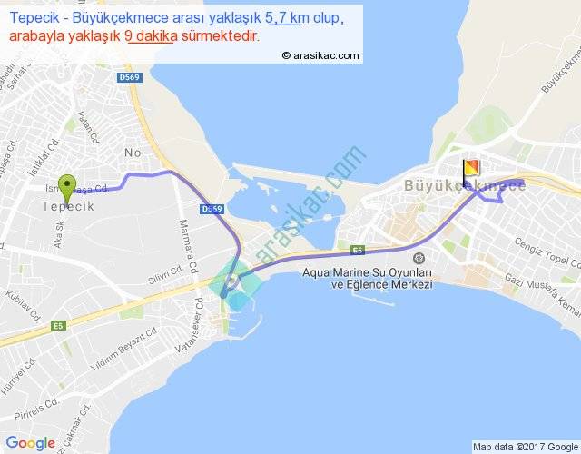 Tepecik - Büyükçekmece arası yaklaşık olarak 90 km/h ile yukarıda belirtilen sürede olup, iki yerin kuş uçuşu uzaklığı (mesafesi) 3'dir. Yolculuk otobüsle 11 dakika sürmektedir.