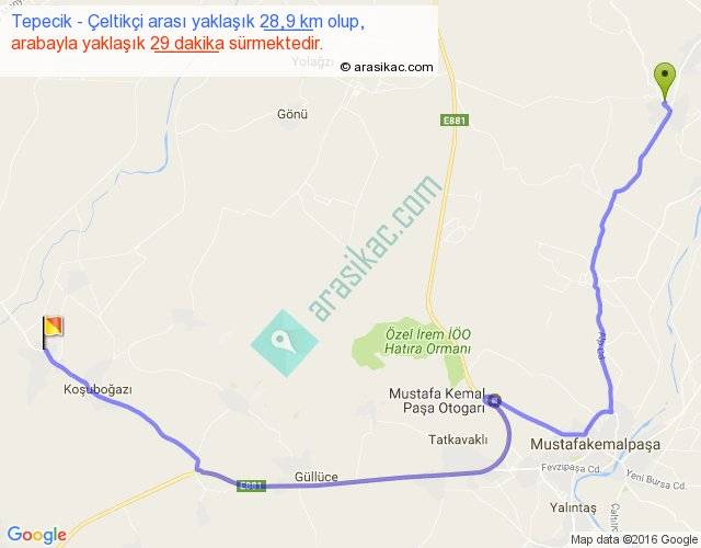 Tepecik - Çeltikçi arası yaklaşık olarak 90 km/h ile yukarıda belirtilen sürede olup, iki yerin kuş uçuşu uzaklığı (mesafesi) 18'dir. Yolculuk otobüsle 37 dakika sürmektedir.