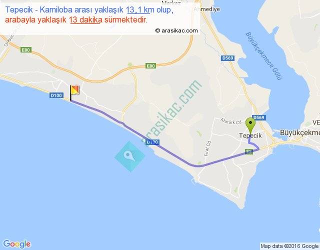 Tepecik - Kamiloba arası yaklaşık olarak 90 km/h ile yukarıda belirtilen sürede olup, iki yerin kuş uçuşu uzaklığı (mesafesi) 10'dir. Yolculuk otobüsle 16 dakika sürmektedir.