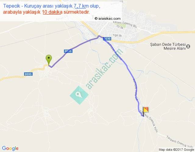 Tepecik - Kuruçay arası yaklaşık olarak 90 km/h ile yukarıda belirtilen sürede olup, iki yerin kuş uçuşu uzaklığı (mesafesi) 5'dir. Yolculuk otobüsle 13 dakika sürmektedir.