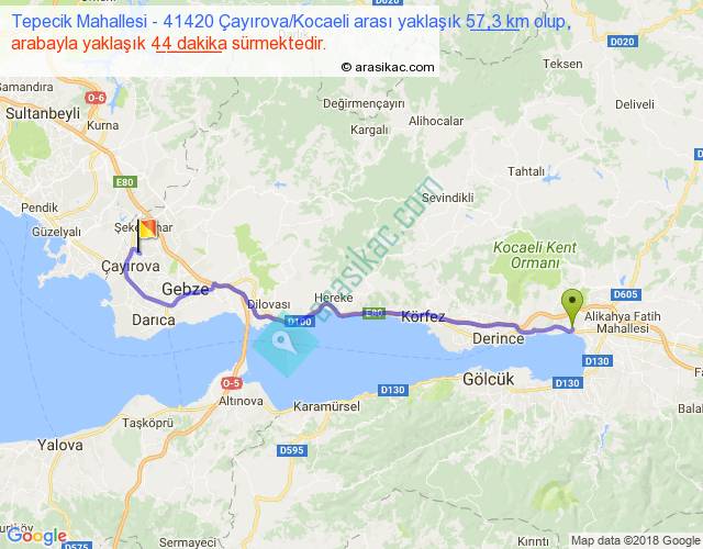 Tepecik Mahallesi - 41420 Çayırova Kocaeli arası yaklaşık olarak 90 km/h ile yukarıda belirtilen sürede olup, iki yerin kuş uçuşu uzaklığı (mesafesi) 46'dir. Yolculuk otobüsle 57 dakika sürmektedir.
