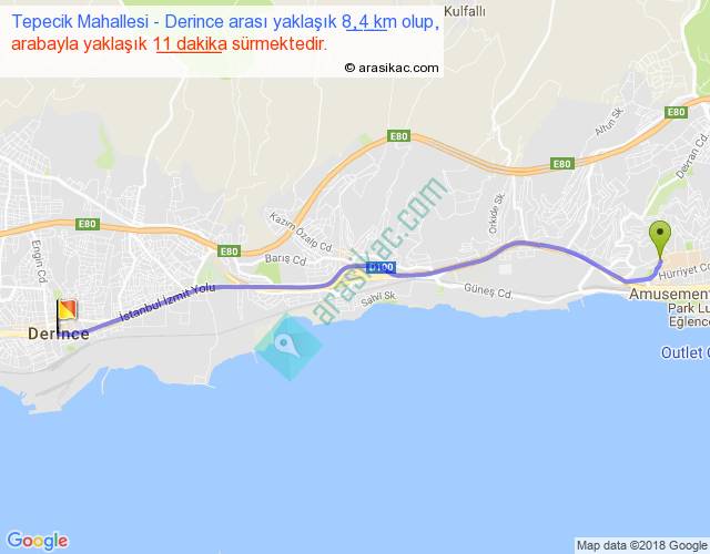 Tepecik Mahallesi - Derince arası yaklaşık olarak 90 km/h ile yukarıda belirtilen sürede olup, iki yerin kuş uçuşu uzaklığı (mesafesi) 8'dir. Yolculuk otobüsle 14 dakika sürmektedir.