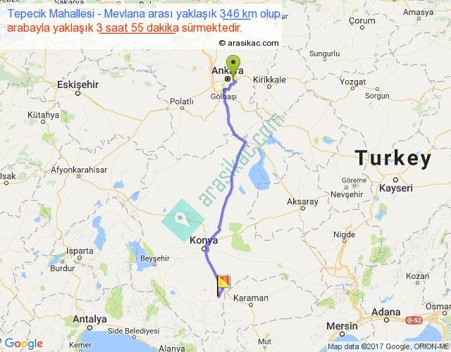 Tepecik Mahallesi - Mevlana arası yaklaşık olarak 90 km/h ile yukarıda belirtilen sürede olup, iki yerin kuş uçuşu uzaklığı (mesafesi) 292'dir. Eğer belirtilen yerler arasında uçak seferi var ise bu süre uçakla 26 dakika'ya kadar düşebilir. Yolculuk otobüsle 5 saat 5 dakika sürmektedir.