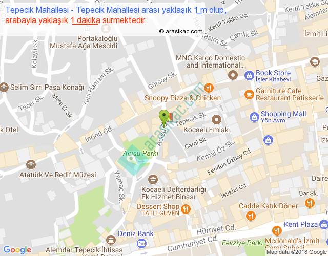 Tepecik Mahallesi - Tepecik Mahallesi arası yaklaşık olarak 90 km/h ile yukarıda belirtilen sürede olup, iki yerin kuş uçuşu uzaklığı (mesafesi) 0'dir. Yolculuk otobüsle 1 dakika sürmektedir.