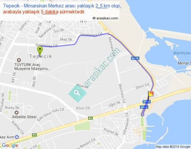 Tepecik - Mimarsinan Merkez arası yaklaşık olarak 90 km/h ile yukarıda belirtilen sürede olup, iki yerin kuş uçuşu uzaklığı (mesafesi) 1'dir. Yolculuk otobüsle 6 dakika sürmektedir.