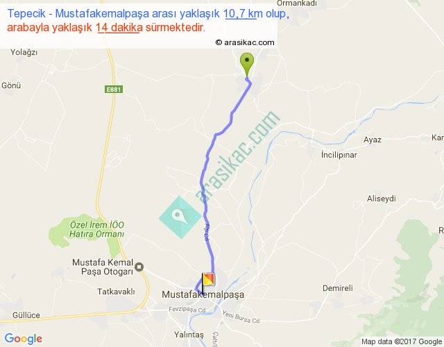 Tepecik - Mustafakemalpaşa arası yaklaşık olarak 90 km/h ile yukarıda belirtilen sürede olup, iki yerin kuş uçuşu uzaklığı (mesafesi) 9'dir. Yolculuk otobüsle 18 dakika sürmektedir.