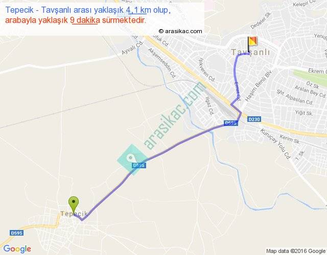 Tepecik - Tavşanlı arası yaklaşık olarak 90 km/h ile yukarıda belirtilen sürede olup, iki yerin kuş uçuşu uzaklığı (mesafesi) 3'dir. Yolculuk otobüsle 11 dakika sürmektedir.