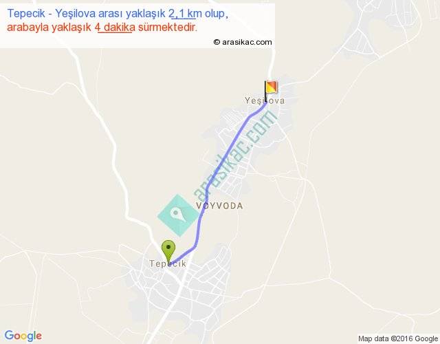 Tepecik - Yeşilova arası yaklaşık olarak 90 km/h ile yukarıda belirtilen sürede olup, iki yerin kuş uçuşu uzaklığı (mesafesi) 2'dir. Yolculuk otobüsle 5 dakika sürmektedir.