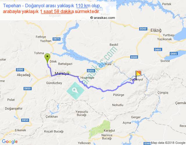 Tepehan - Doğanyol arası yaklaşık olarak 90 km/h ile yukarıda belirtilen sürede olup, iki yerin kuş uçuşu uzaklığı (mesafesi) 74'dir. Yolculuk otobüsle 2 saat 33 dakika sürmektedir.