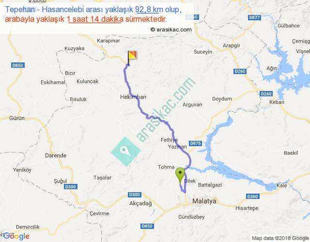 Tepehan - Hasancelebi arası yaklaşık olarak 90 km/h ile yukarıda belirtilen sürede olup, iki yerin kuş uçuşu uzaklığı (mesafesi) 64'dir. Yolculuk otobüsle 1 saat 36 dakika sürmektedir.