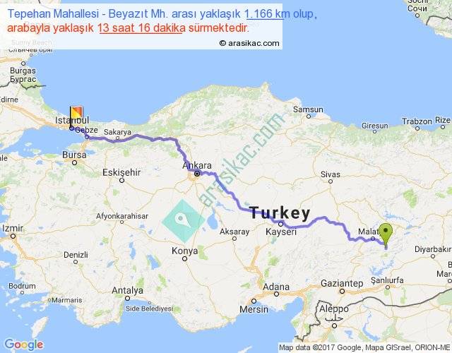 Tepehan Mahallesi - Beyazıt Mh. arası yaklaşık olarak 90 km/h ile yukarıda belirtilen sürede olup, iki yerin kuş uçuşu uzaklığı (mesafesi) 891'dir. Eğer belirtilen yerler arasında uçak seferi var ise bu süre uçakla 1 saat 22 dakika'ya kadar düşebilir. Yolculuk otobüsle 17 saat 14 dakika sürmektedir.