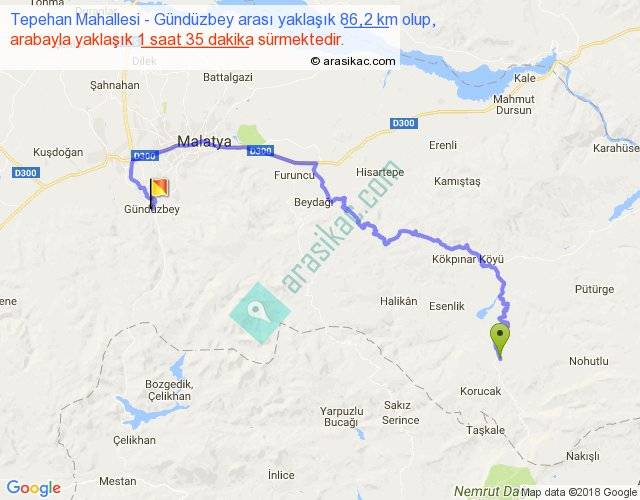 Tepehan Mahallesi - Gündüzbey arası yaklaşık olarak 90 km/h ile yukarıda belirtilen sürede olup, iki yerin kuş uçuşu uzaklığı (mesafesi) 45'dir. Yolculuk otobüsle 2 saat 3 dakika sürmektedir.