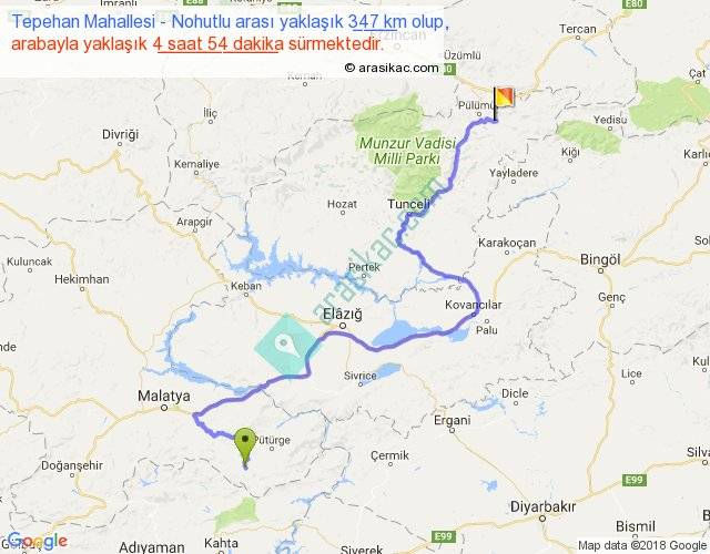 Tepehan Mahallesi - Nohutlu arası yaklaşık olarak 90 km/h ile yukarıda belirtilen sürede olup, iki yerin kuş uçuşu uzaklığı (mesafesi) 183'dir. Yolculuk otobüsle 6 saat 22 dakika sürmektedir.