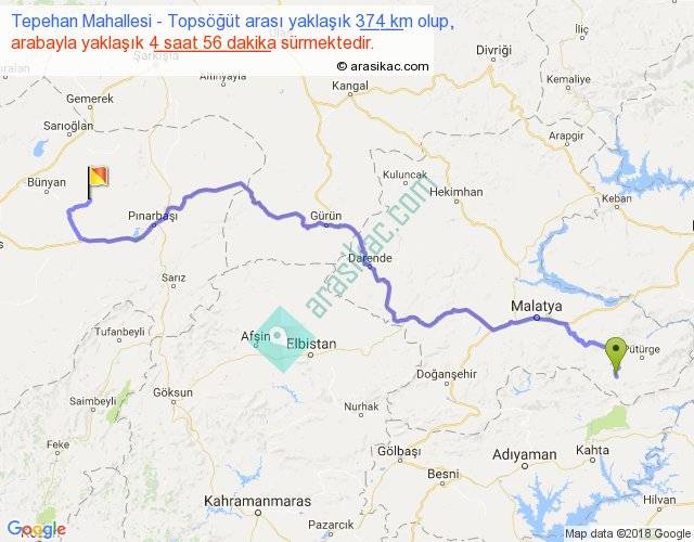 Tepehan Mahallesi - Topsöğüt arası yaklaşık olarak 90 km/h ile yukarıda belirtilen sürede olup, iki yerin kuş uçuşu uzaklığı (mesafesi) 243'dir. Yolculuk otobüsle 6 saat 24 dakika sürmektedir.