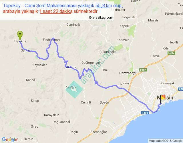 Tepeköy - Cami Şerif Mahallesi arası yaklaşık olarak 90 km/h ile yukarıda belirtilen sürede olup, iki yerin kuş uçuşu uzaklığı (mesafesi) 33'dir. Yolculuk otobüsle 1 saat 46 dakika sürmektedir.