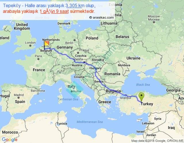 Tepeköy - Halle arası yaklaşık olarak 90 km/h ile yukarıda belirtilen sürede olup, iki yerin kuş uçuşu uzaklığı (mesafesi) 2619'dir. Eğer belirtilen yerler arasında uçak seferi var ise bu süre uçakla 4 saat 01 dakika'ya kadar düşebilir. Yolculuk otobüsle 1 gün 18 saat sürmektedir.