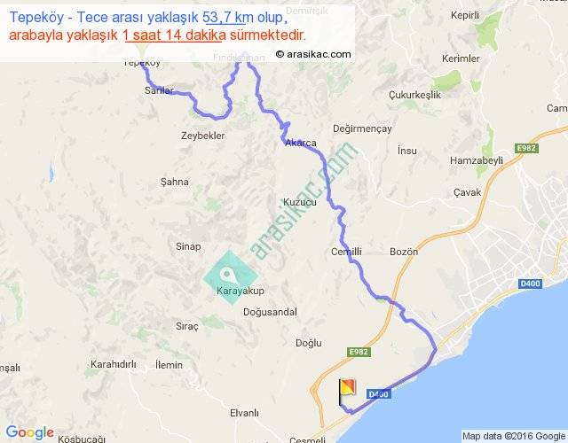 Tepeköy - Tece arası yaklaşık olarak 90 km/h ile yukarıda belirtilen sürede olup, iki yerin kuş uçuşu uzaklığı (mesafesi) 27'dir. Yolculuk otobüsle 1 saat 36 dakika sürmektedir.