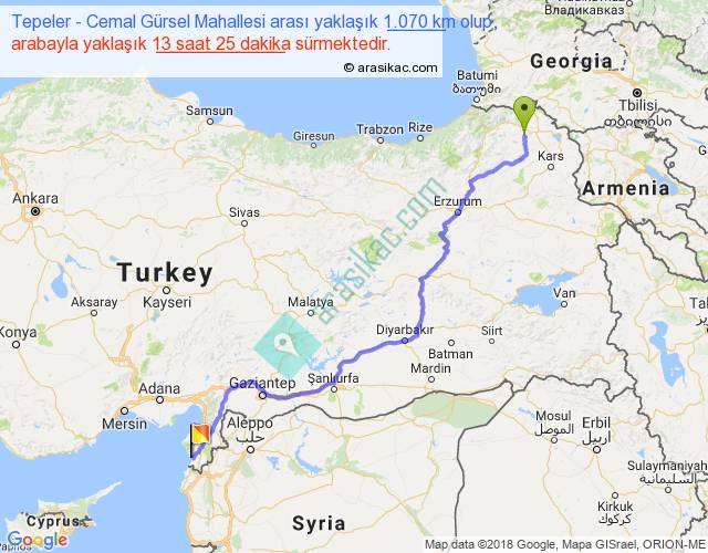 Tepeler - Cemal Gürsel Mahallesi arası yaklaşık olarak 90 km/h ile yukarıda belirtilen sürede olup, iki yerin kuş uçuşu uzaklığı (mesafesi) 792'dir. Eğer belirtilen yerler arasında uçak seferi var ise bu süre uçakla 1 saat 13 dakika'ya kadar düşebilir. Yolculuk otobüsle 17 saat 26 dakika sürmektedir.