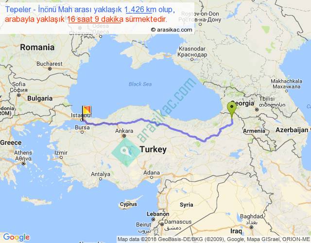 Tepeler - İnönü Mah arası yaklaşık olarak 90 km/h ile yukarıda belirtilen sürede olup, iki yerin kuş uçuşu uzaklığı (mesafesi) 1118'dir. Eğer belirtilen yerler arasında uçak seferi var ise bu süre uçakla 1 saat 43 dakika'ya kadar düşebilir. Yolculuk otobüsle 20 saat 59 dakika sürmektedir.