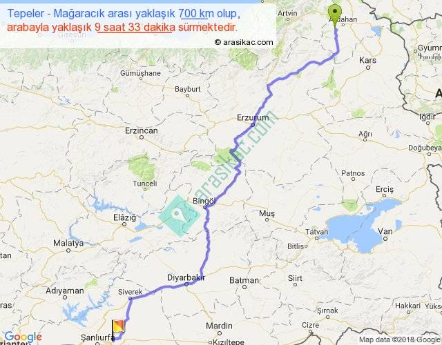 Tepeler - Mağaracık arası yaklaşık olarak 90 km/h ile yukarıda belirtilen sürede olup, iki yerin kuş uçuşu uzaklığı (mesafesi) 523'dir. Eğer belirtilen yerler arasında uçak seferi var ise bu süre uçakla 48 dakika'ya kadar düşebilir. Yolculuk otobüsle 12 saat 24 dakika sürmektedir.