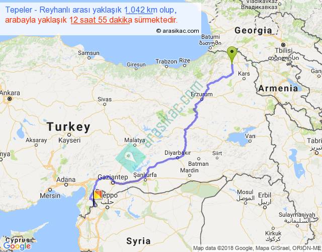 Tepeler - Reyhanlı arası yaklaşık olarak 90 km/h ile yukarıda belirtilen sürede olup, iki yerin kuş uçuşu uzaklığı (mesafesi) 741'dir. Eğer belirtilen yerler arasında uçak seferi var ise bu süre uçakla 1 saat 08 dakika'ya kadar düşebilir. Yolculuk otobüsle 16 saat 47 dakika sürmektedir.