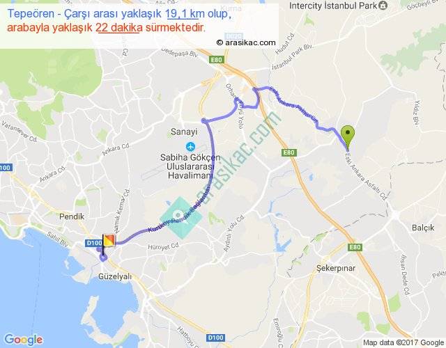 Tepeören - Çarşı arası yaklaşık olarak 90 km/h ile yukarıda belirtilen sürede olup, iki yerin kuş uçuşu uzaklığı (mesafesi) 11'dir. Yolculuk otobüsle 28 dakika sürmektedir.