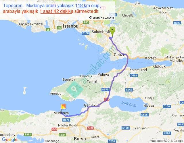 Tepeören - Mudanya arası yaklaşık olarak 90 km/h ile yukarıda belirtilen sürede olup, iki yerin kuş uçuşu uzaklığı (mesafesi) 74'dir. Yolculuk otobüsle 2 saat 12 dakika sürmektedir.