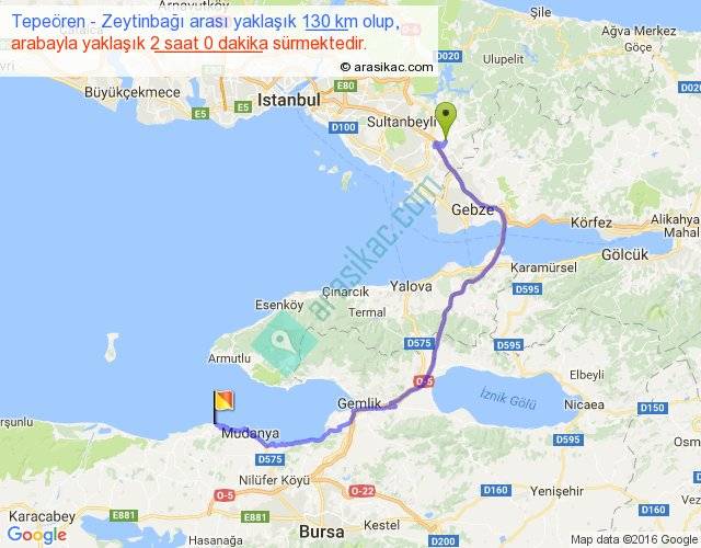 Tepeören - Zeytinbağı arası yaklaşık olarak 90 km/h ile yukarıda belirtilen sürede olup, iki yerin kuş uçuşu uzaklığı (mesafesi) 77'dir. Yolculuk otobüsle 2 saat 36 dakika sürmektedir.