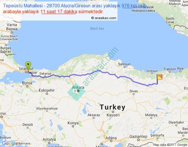Tepeüstü Mahallesi - 28700 Alucra Giresun arası yaklaşık olarak 90 km/h ile yukarıda belirtilen sürede olup, iki yerin kuş uçuşu uzaklığı (mesafesi) 813'dir. Eğer belirtilen yerler arasında uçak seferi var ise bu süre uçakla 1 saat 15 dakika'ya kadar düşebilir. Yolculuk otobüsle 14 saat 40 dakika sürmektedir.