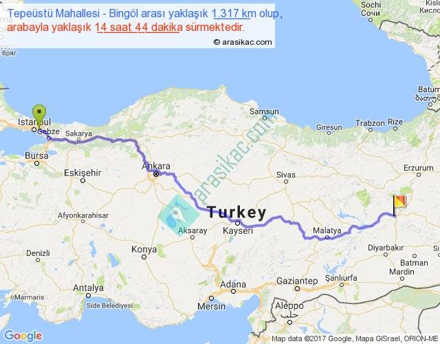 Tepeüstü Mahallesi - Bingöl arası yaklaşık olarak 90 km/h ile yukarıda belirtilen sürede olup, iki yerin kuş uçuşu uzaklığı (mesafesi) 990'dir. Eğer belirtilen yerler arasında uçak seferi var ise bu süre uçakla 1 saat 31 dakika'ya kadar düşebilir. Yolculuk otobüsle 19 saat 9 dakika sürmektedir.