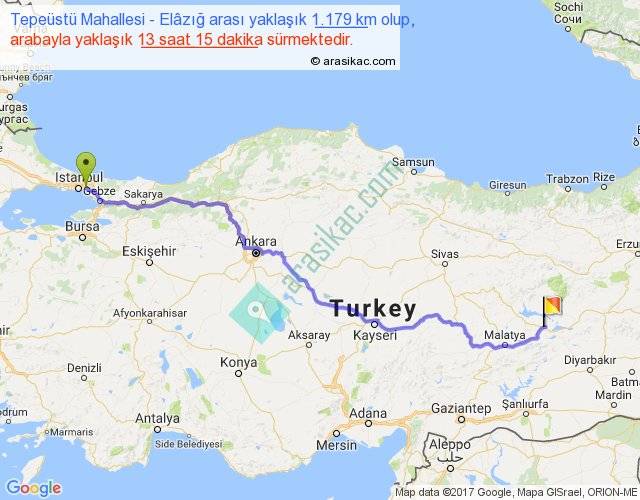 Tepeüstü Mahallesi - Elâzığ arası yaklaşık olarak 90 km/h ile yukarıda belirtilen sürede olup, iki yerin kuş uçuşu uzaklığı (mesafesi) 894'dir. Eğer belirtilen yerler arasında uçak seferi var ise bu süre uçakla 1 saat 22 dakika'ya kadar düşebilir. Yolculuk otobüsle 17 saat 13 dakika sürmektedir.