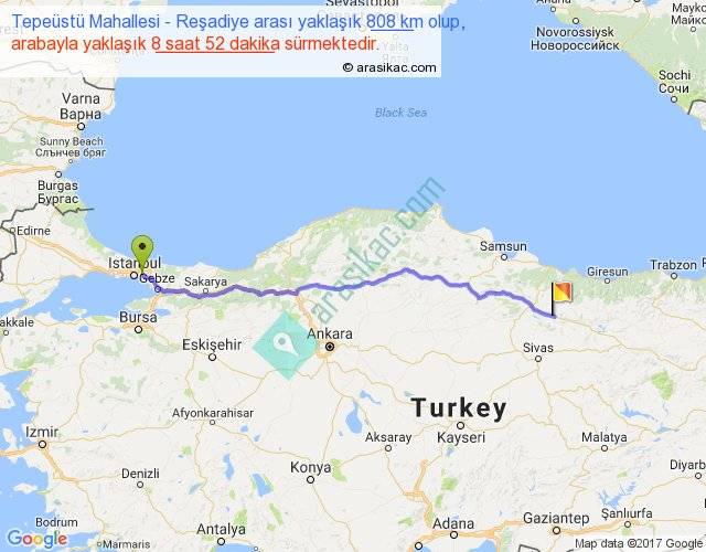 Tepeüstü Mahallesi - Reşadiye arası yaklaşık olarak 90 km/h ile yukarıda belirtilen sürede olup, iki yerin kuş uçuşu uzaklığı (mesafesi) 690'dir. Eğer belirtilen yerler arasında uçak seferi var ise bu süre uçakla 1 saat 03 dakika'ya kadar düşebilir. Yolculuk otobüsle 11 saat 31 dakika sürmektedir.