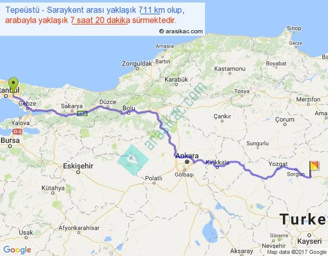 Tepeüstü - Saraykent arası yaklaşık olarak 90 km/h ile yukarıda belirtilen sürede olup, iki yerin kuş uçuşu uzaklığı (mesafesi) 556'dir. Eğer belirtilen yerler arasında uçak seferi var ise bu süre uçakla 51 dakika'ya kadar düşebilir. Yolculuk otobüsle 9 saat 32 dakika sürmektedir.
