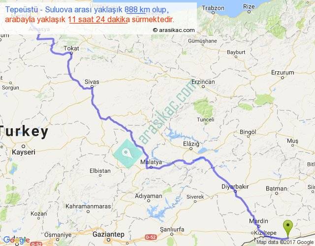 Tepeüstü - Suluova arası yaklaşık olarak 90 km/h ile yukarıda belirtilen sürede olup, iki yerin kuş uçuşu uzaklığı (mesafesi) 642'dir. Eğer belirtilen yerler arasında uçak seferi var ise bu süre uçakla 59 dakika'ya kadar düşebilir. Yolculuk otobüsle 14 saat 49 dakika sürmektedir.